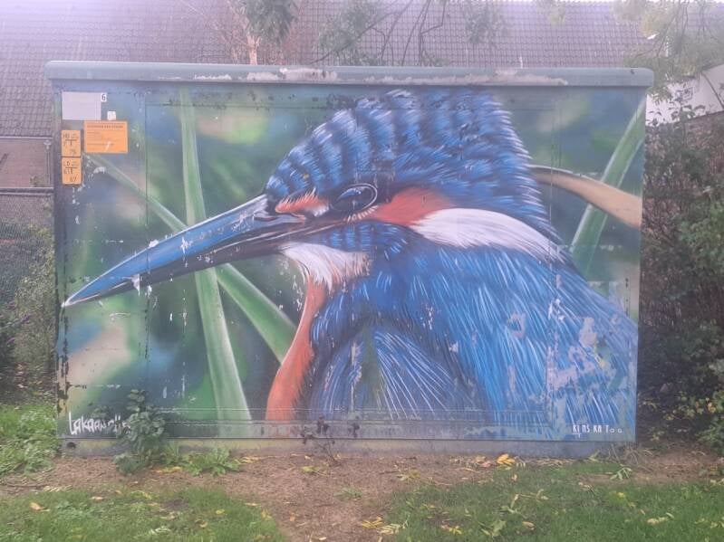 Tijdens mijn wandeling werd ik wel zeer bijzonder beloond. Heb voor het eerst een ijsvogel mogen spotten. Nu zullen er wel mensen zijn die denken, jaja het zal wel meneer de zwammer (of was het nu de zwemmer, het regende behoorlijk). Maar het bewijs op de foto zal laten zien dat ik volledig de waarheid spreek en zeer betrouwbaar ben. Kijk maar.......