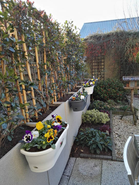 Daardoor verdween de schutting, omdat de Photinia's in bakken voor de schutting kwamen, en dan konden we op die plek zomers geen hangbakken met Surfinia plaatsen.